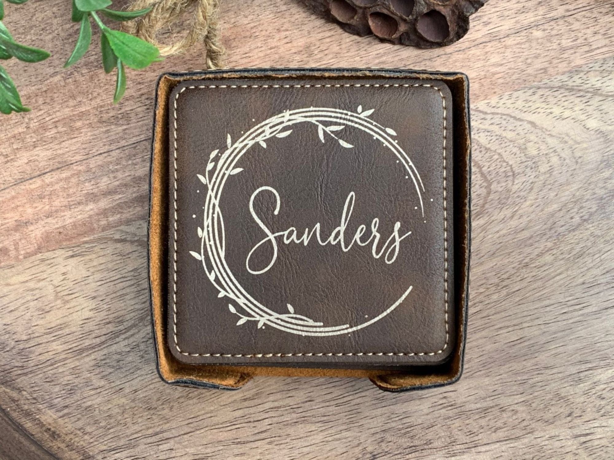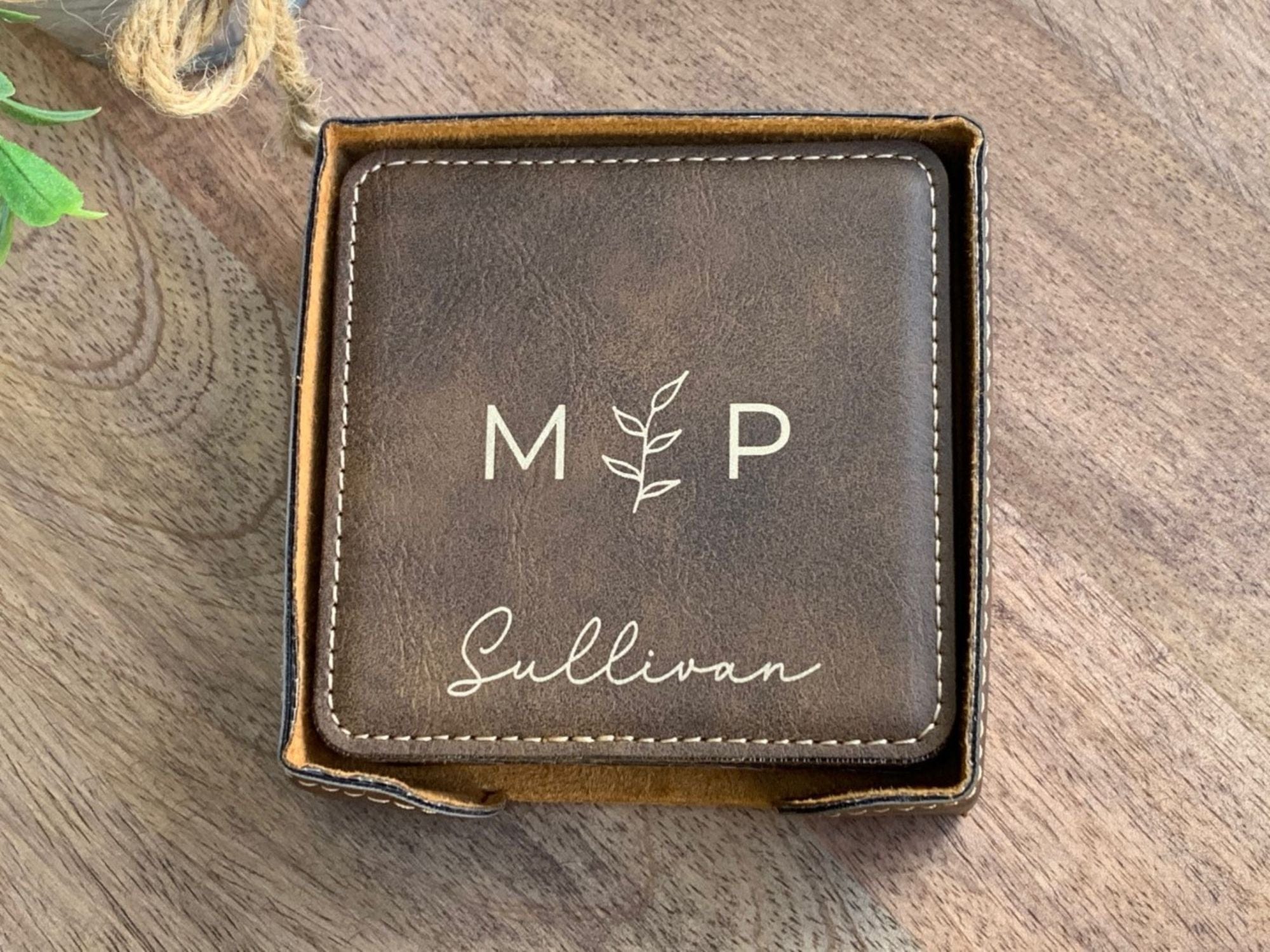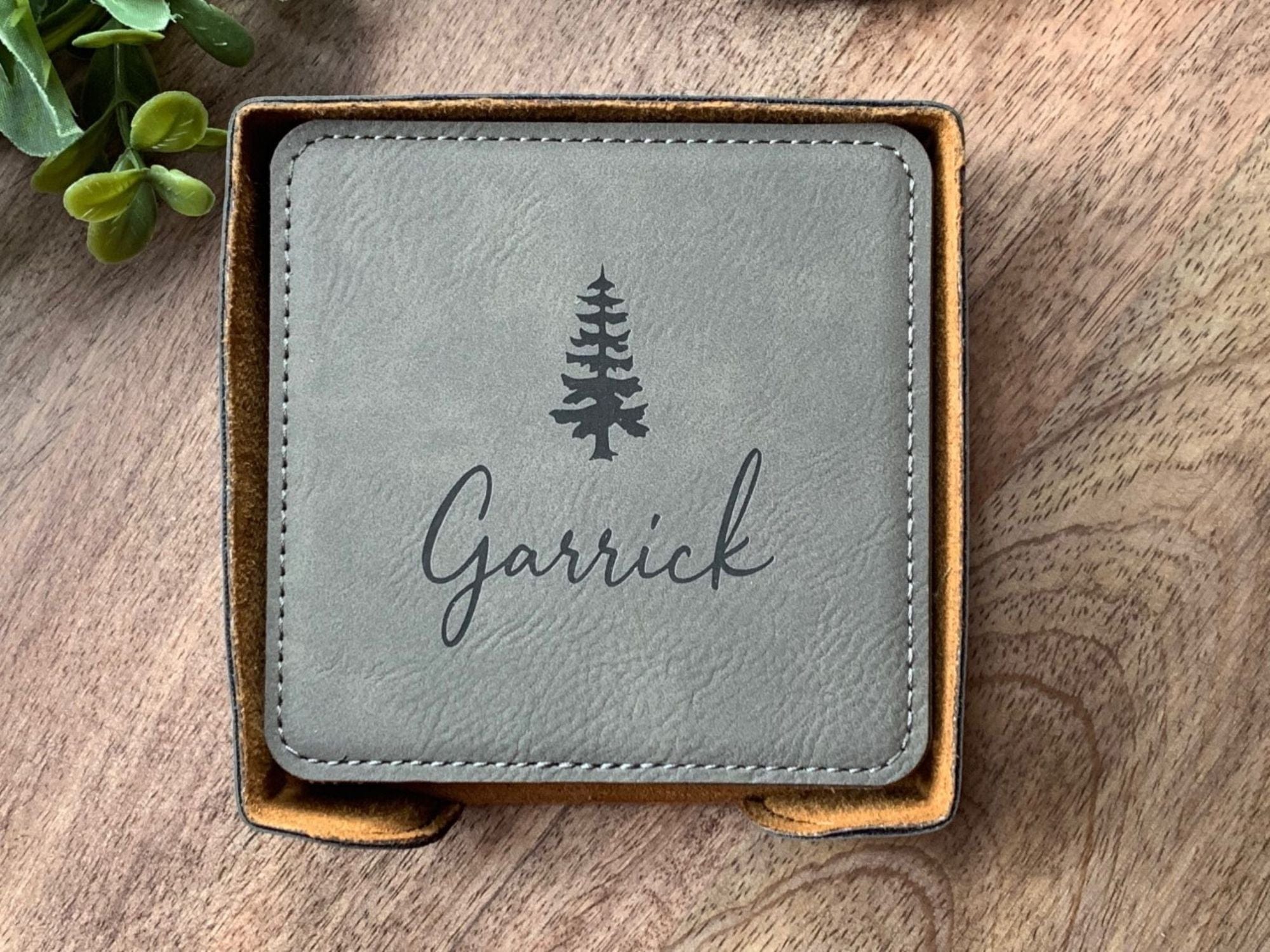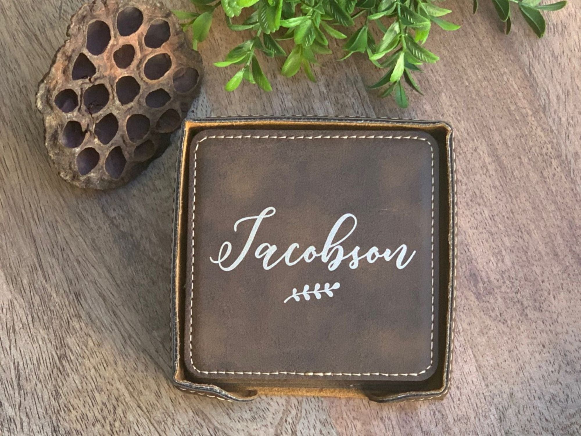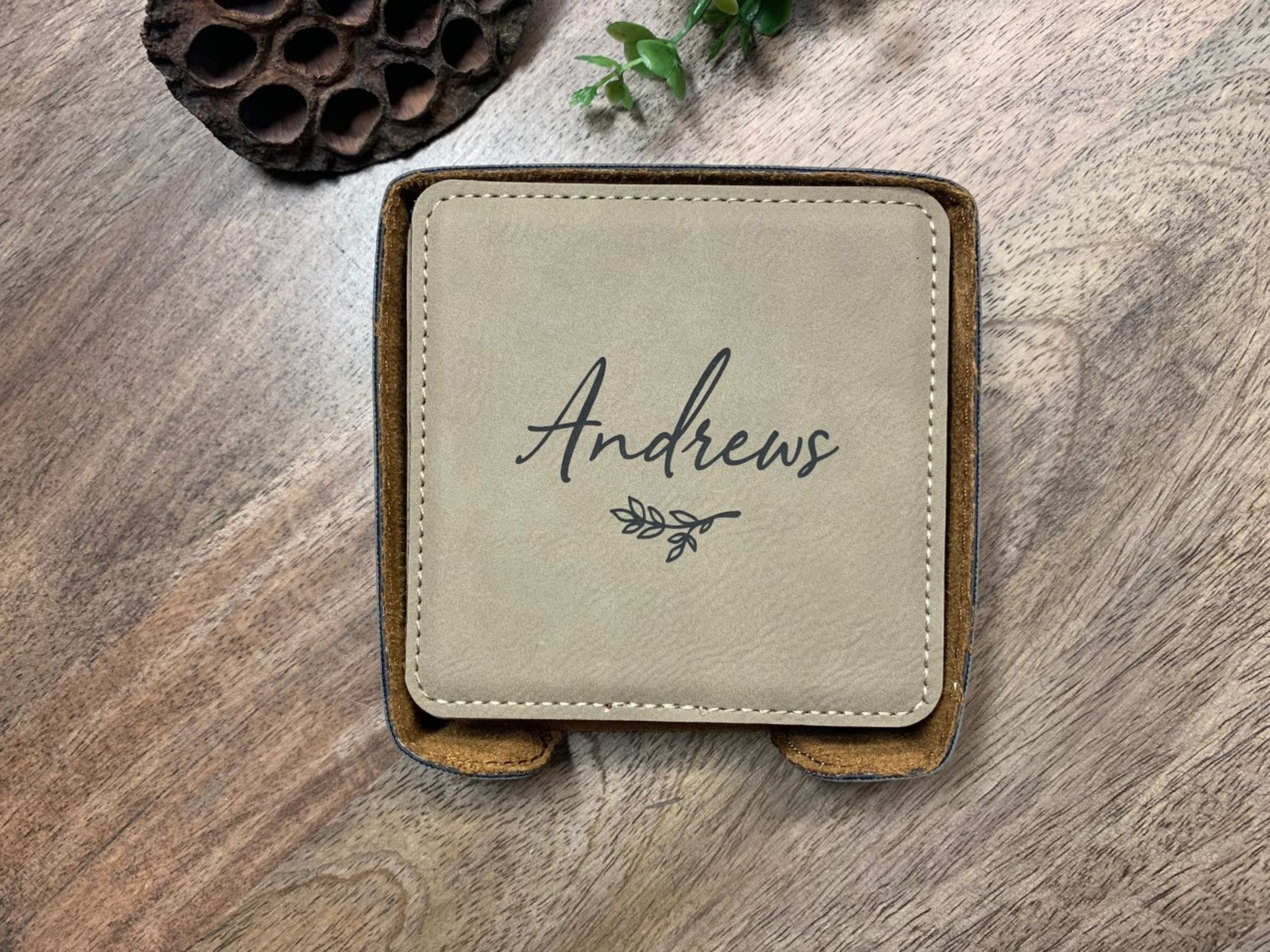 Engraved Coaster Set With Leaf Design Personalized With Name