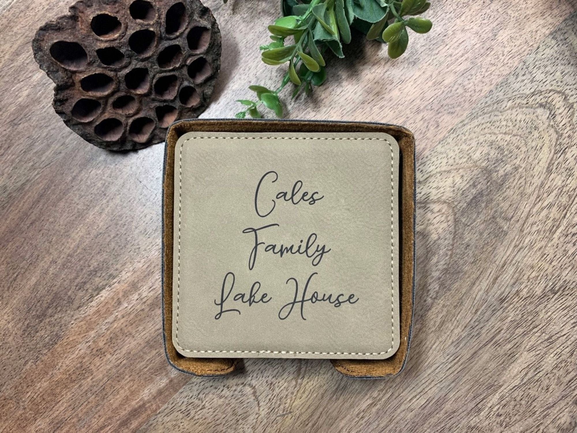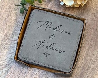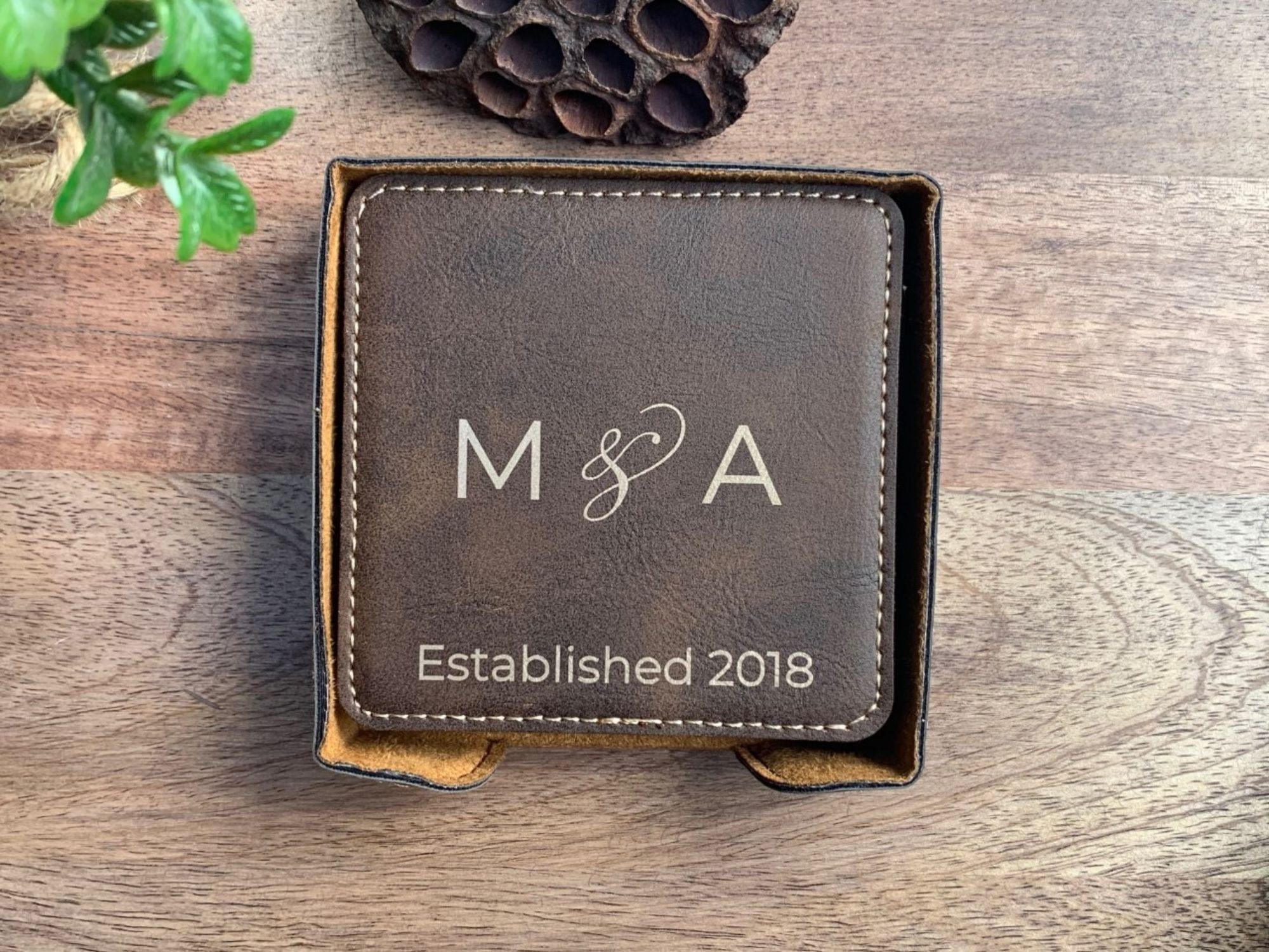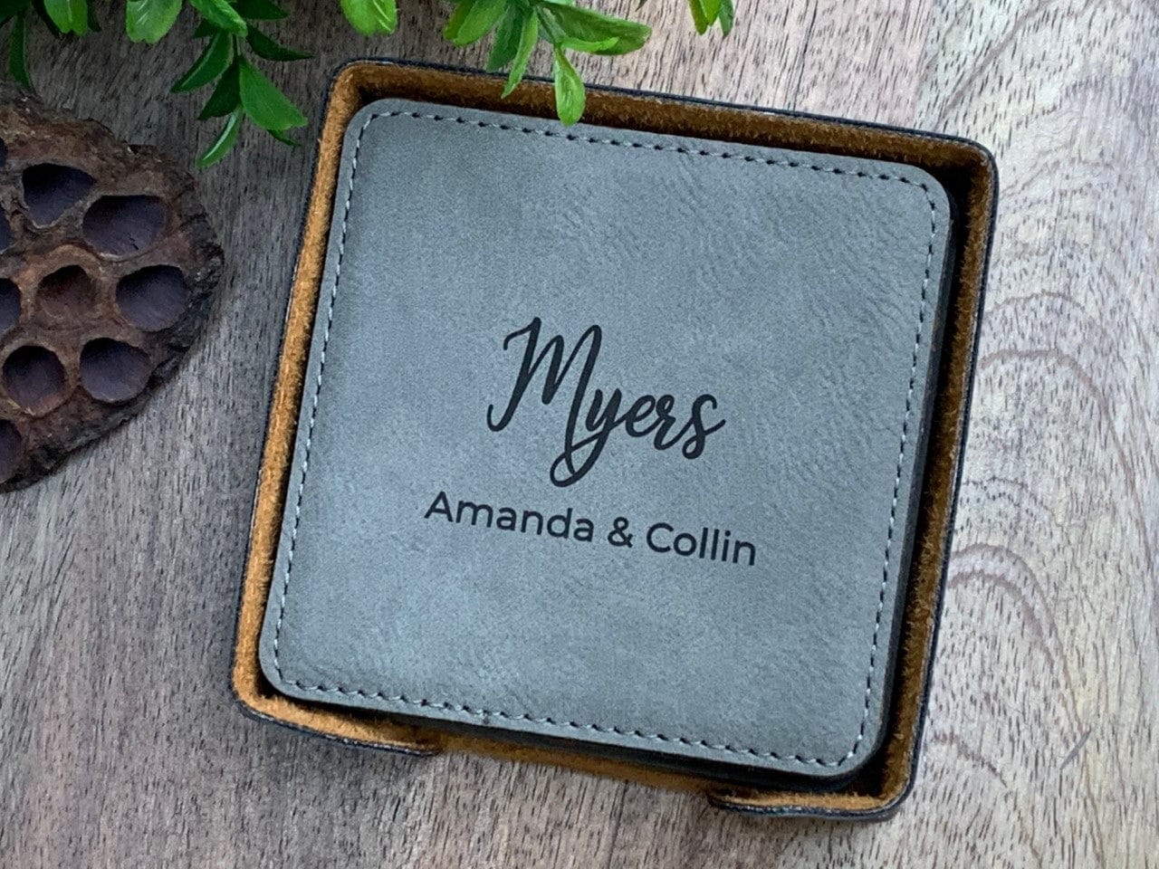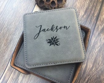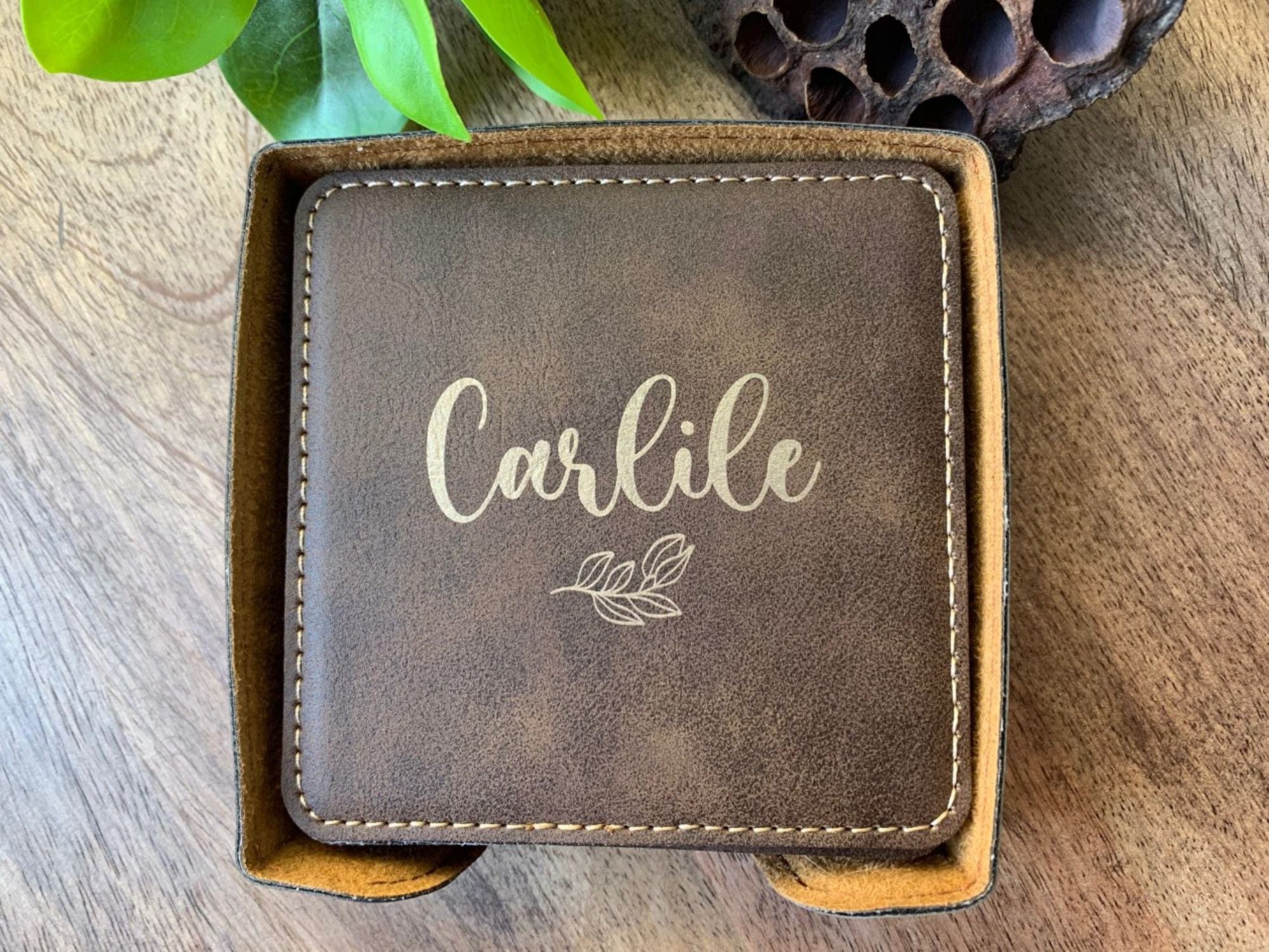 Engraved Coaster Set With Leaf Design Personalized With Name