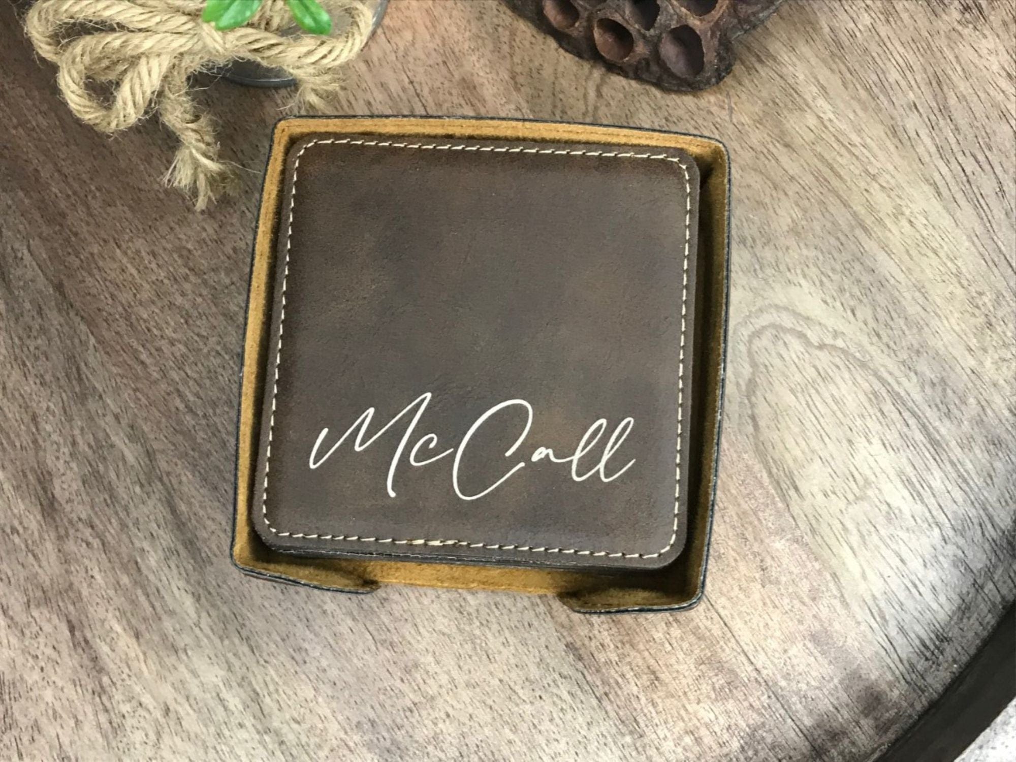 Set Of 6 Personalized Leatherette Coasters With Holder